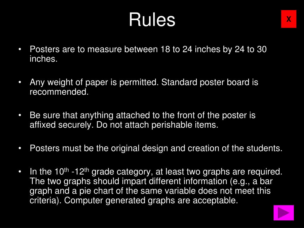 Rules • Posters are to measure between 18 to 24 inches by 24 to 30 inches. • Any weight of paper is permitted. Standard poster board is recommended. • Be sure that anything attached to the front of the poster is affixed securely. Do not attach perishable items. • Posters must be the original design and creation of the students. • In the 10th -12th grade category, at least two graphs are required. The two graphs should impart different information (e.g., a bar graph and a pie chart of the same variable does not meet this criteria). Computer generated graphs are acceptable.