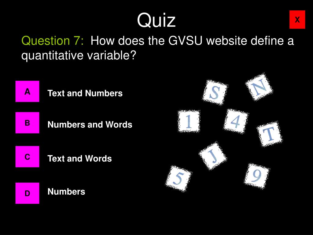 Quiz Question 7: How does the GVSU website define a quantitative variable? A Text and Numbers B Numbers and Words C Text and Words D Numbers