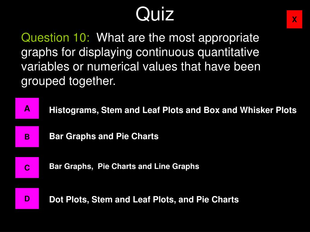 Quiz Question 10: What are the most appropriate graphs for displaying continuous quantitative variables or numerical values that have been grouped together. A Histograms, Stem and Leaf Plots and Box and Whisker Plots B Bar Graphs and Pie Charts C Bar Graphs, Pie Charts and Line Graphs D Dot Plots, Stem and Leaf Plots, and Pie Charts