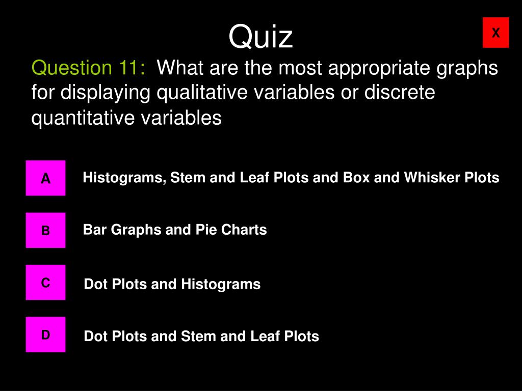 Quiz Question 11: What are the most appropriate graphs for displaying qualitative variables or discrete quantitative variables A Histograms, Stem and Leaf Plots and Box and Whisker Plots B Bar Graphs and Pie Charts C Dot Plots and Histograms D Dot Plots and Stem and Leaf Plots