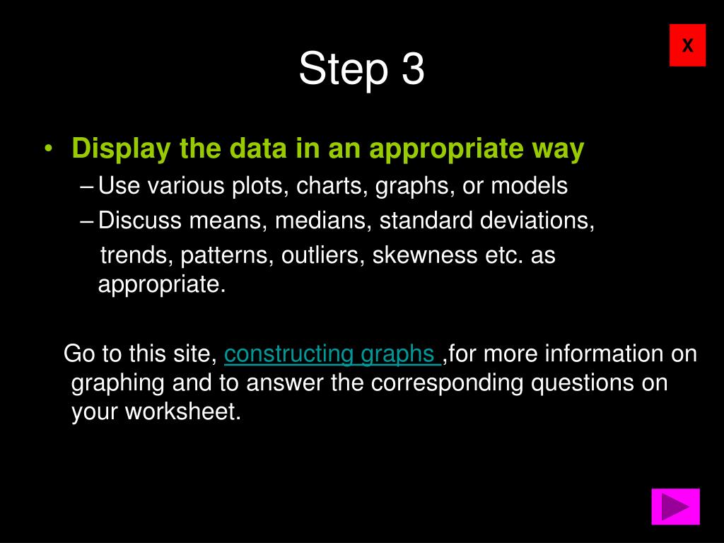Step 3 • Display the data in an appropriateway • Use various plots, charts, graphs, or models • Discuss means, medians, standard deviations, trends, patterns, outliers, skewness etc. as appropriate. Go to this site, constructing graphs ,for more information on graphing and to answer the corresponding questions on your worksheet.