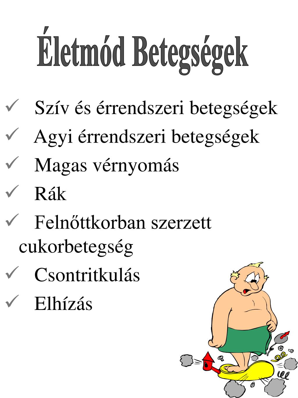 Életmód Betegségek • Szív és érrendszeri betegségek • Agyi érrendszeri betegségek • Magas vérnyomás • Rák • Felnőttkorban szerzett cukorbetegség • Csontritkulás • Elhízás