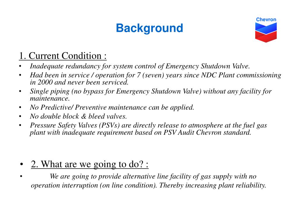 Chevron Background 1. Current Condition : • Inadequate redundancy for system control of Emergency Shutdown Valve. • Had been in service / operation for 7 (seven) years since NDC Plant commissioning in 2000 and never been serviced. • Single piping (no bypass for Emergency Shutdown Valve) without any facility for maintenance. • No Predictive/ Preventive maintenance can be applied. • No double block & bleed valves. • Pressure Safety Valves (PSVs) are directly release to atmosphere at the fuel gas plant with inadequate requirement based on PSV Audit Chevron standard. • 2. What are we going to do? : • We are going to provide alternative line facility of gas supply with no operation interruption (on line condition). Thereby increasing plant reliability.