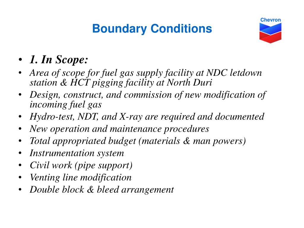 Chevron Boundary Conditions • 1. In Scope: • Area of scope for fuel gas supply facility at NDC letdown station & HCT pigging facility at North Duri • Design, construct, and commission of new modification of incoming fuel gas • Hydro-test, NDT, and X-ray are required and documented • New operation and maintenance procedures • Total appropriated budget (materials & man powers) • Instrumentation system • Civil work (pipe support) • Venting line modification • Double block & bleed arrangement