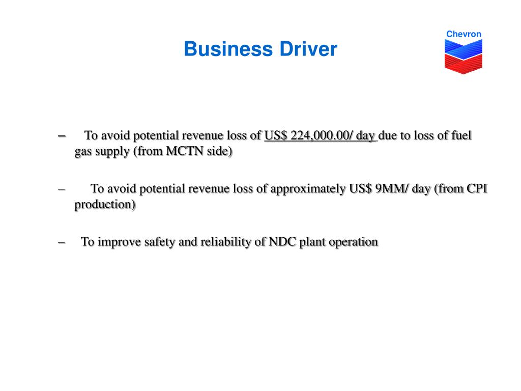 Chevron Business Driver • To avoid potential revenue loss of US$ 224,000.00/ daydue to loss of fuel gas supply (from MCTN side) • To avoid potential revenue loss of approximately US$ 9MM/ day (from CPI production) • To improve safety and reliability of NDC plant operation