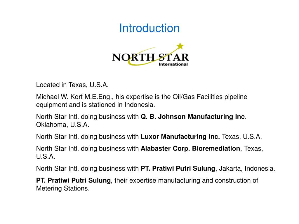Introduction Located in Texas, U.S.A. Michael W. Kort M.E.Eng., his expertise is the Oil/Gas Facilities pipeline equipment and is stationed in Indonesia. North Star Intl. doing business with Q. B. Johnson Manufacturing Inc. Oklahoma, U.S.A. North Star Intl. doing business with Luxor Manufacturing Inc. Texas, U.S.A. North Star Intl. doing business with Alabaster Corp. Bioremediation, Texas, U.S.A. North Star Intl. doing business with PT. Pratiwi Putri Sulung, Jakarta, Indonesia. PT. Pratiwi Putri Sulung, their expertise manufacturing and construction of Metering Stations.