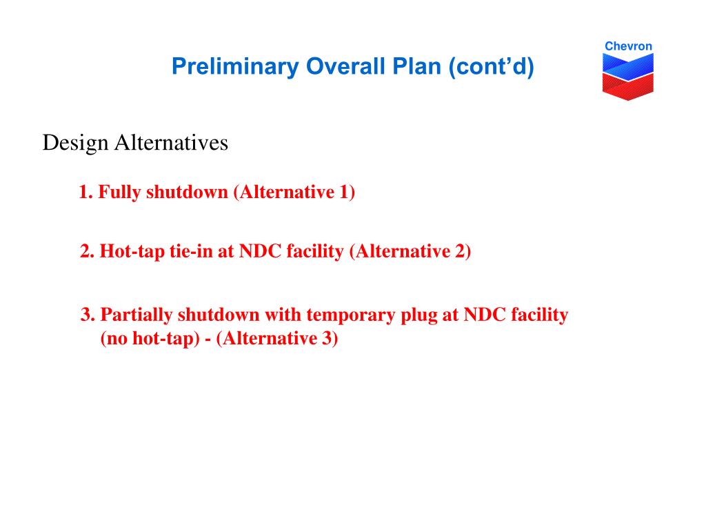 Chevron Preliminary Overall Plan (cont’d) Design Alternatives 1. Fully shutdown (Alternative 1) 2. Hot-tap tie-in at NDC facility (Alternative 2) 3. Partially shutdown with temporary plug at NDC facility (no hot-tap) - (Alternative 3)