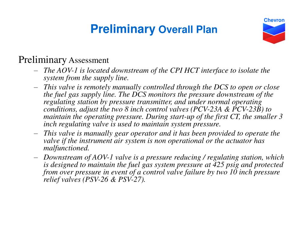 Chevron Preliminary Overall Plan Preliminary Assessment • The AOV-1 is located downstream of the CPI HCT interface to isolate the system from the supply line. • This valve is remotely manually controlled through the DCS to open or close the fuel gas supply line. The DCS monitors the pressure downstream of the regulating station by pressure transmitter, and under normal operating conditions, adjust the two 8 inch control valves (PCV-23A & PCV-23B) to maintain the operating pressure. During start-up of the first CT, the smaller 3 inch regulating valve is used to maintain system pressure. • This valve is manually gear operator and it has been provided to operate the valve if the instrument air system is non operational or the actuator has malfunctioned. • Downstream of AOV-1 valve is a pressure reducing / regulating station, which is designed to maintain the fuel gas system pressure at 425 psig and protected from over pressure in event of a control valve failure by two 10 inch pressure relief valves (PSV-26 & PSV-27).