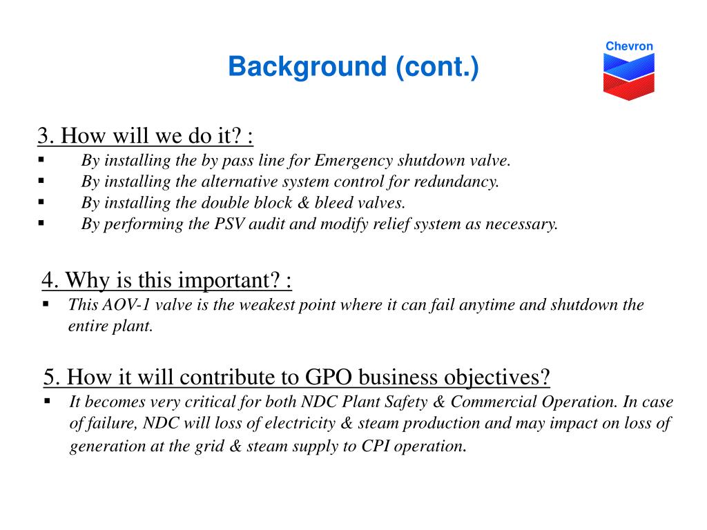Chevron Background(cont.) • 3. How will we do it? : • By installing the by pass line for Emergency shutdown valve. • By installing the alternative system control for redundancy. • By installing the double block & bleed valves. • By performing the PSV audit and modify relief system as necessary. • 4. Why is this important? : • This AOV-1 valve is the weakest point where it can fail anytime and shutdown the entire plant. • 5. How it will contribute to GPO business objectives? • It becomes very critical for both NDC Plant Safety & Commercial Operation. In case of failure, NDC will loss of electricity & steam production and may impact on loss of generation at the grid & steam supply to CPI operation.