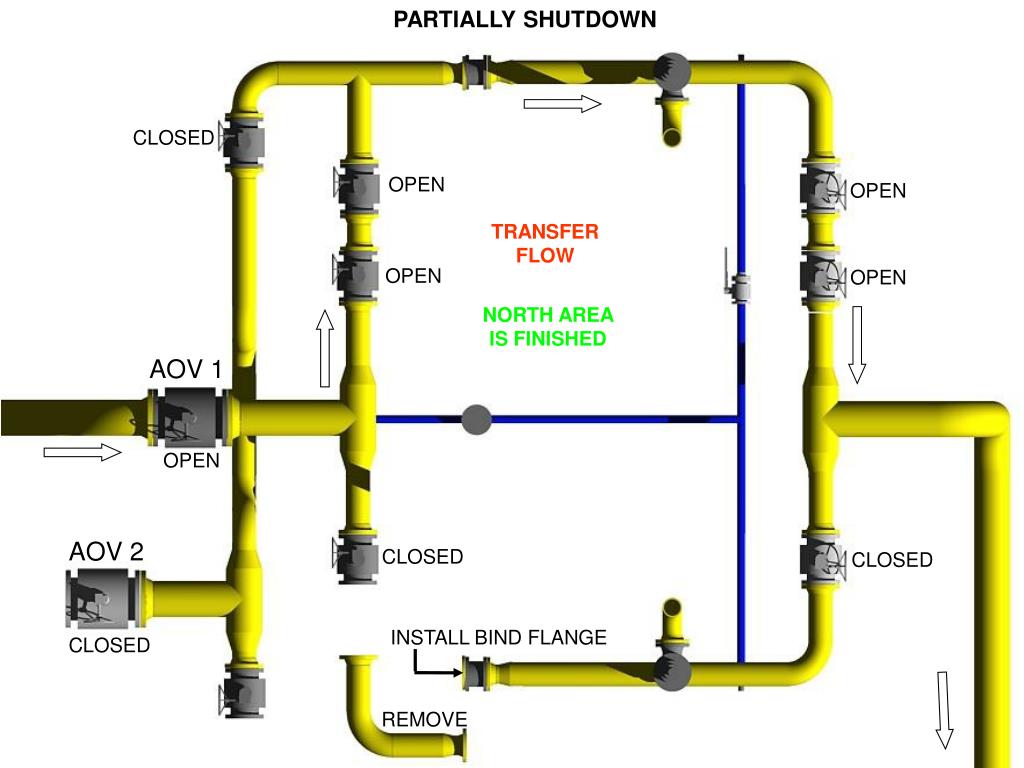 PARTIALLYSHUTDOWN CLOSED OPEN OPEN TRANSFER FLOW OPEN OPEN NORTH AREA IS FINISHED AOV 1 OPEN AOV 2 CLOSED CLOSED INSTALL BIND FLANGE CLOSED REMOVE