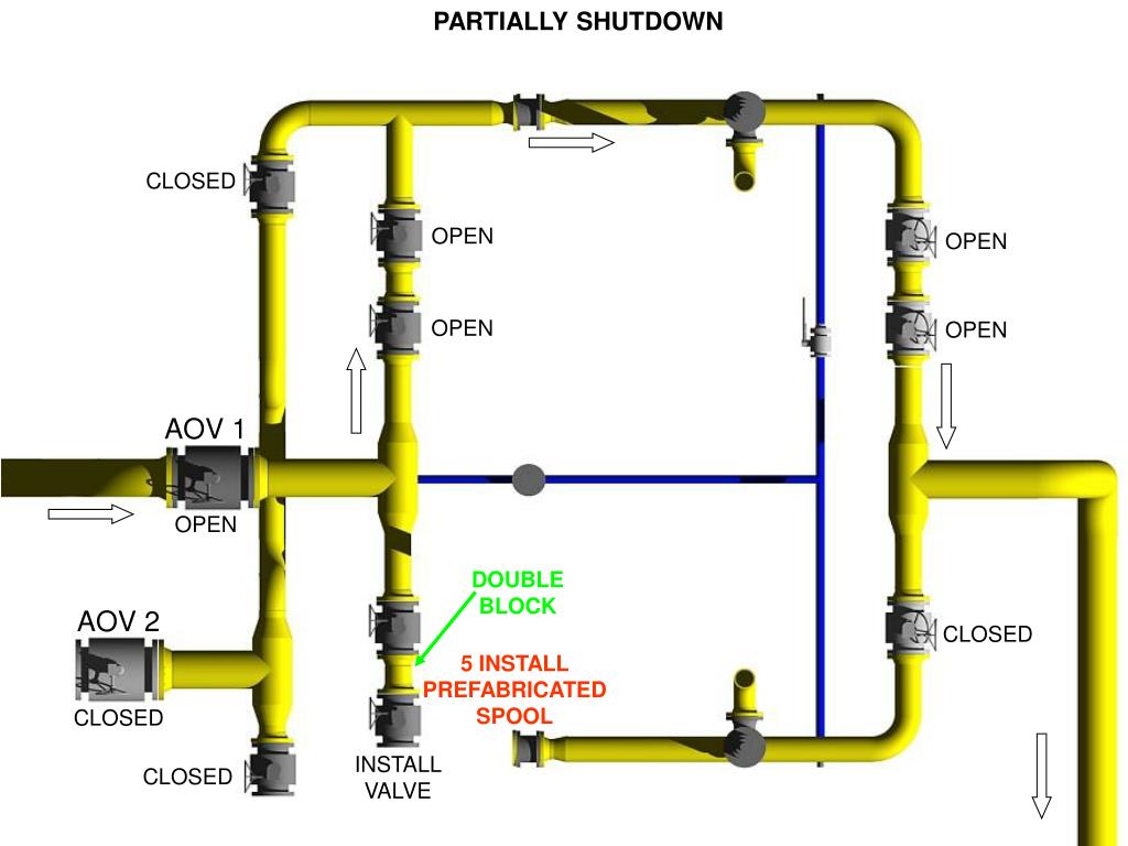 PARTIALLYSHUTDOWN CLOSED OPEN OPEN OPEN OPEN AOV 1 OPEN INSTALL VALVE AOV 2 CLOSED CLOSED 6 INSTALL PREFABRICATED SPOOL DOUBLE BLOCK CLOSED CLOSED CLOSED INSTALL VALVE CLOSED