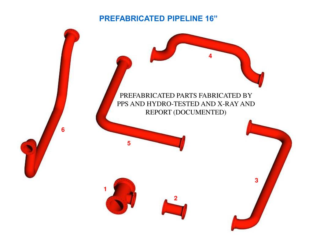 PREFABRICATED PIPELINE 16” 4 PREFABRICATED PARTS FABRICATED BY PPS AND HYDRO-TESTED AND X-RAY AND REPORT (DOCUMENTED) 6 5 3 1 2