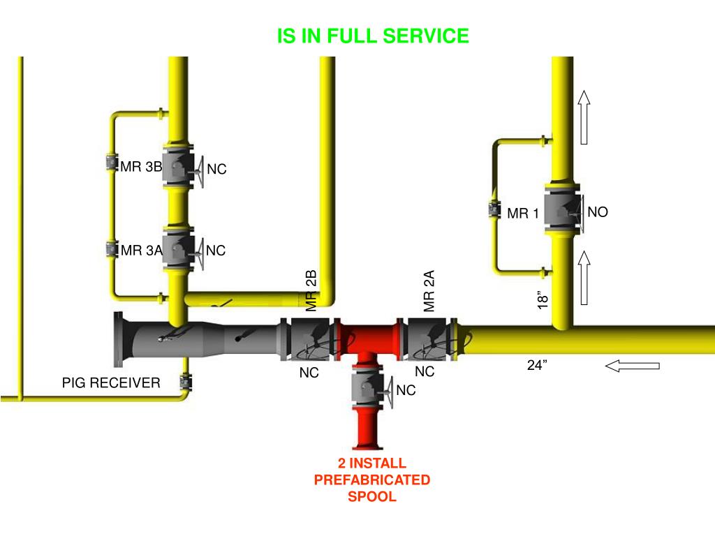IS IN FULL SERVICE MR 3B NC NO MR 1 MR 3A NC MR 2B MR 2A 18” 24” NC NC PIG RECEIVER NC 2 INSTALL PREFABRICATED SPOOL