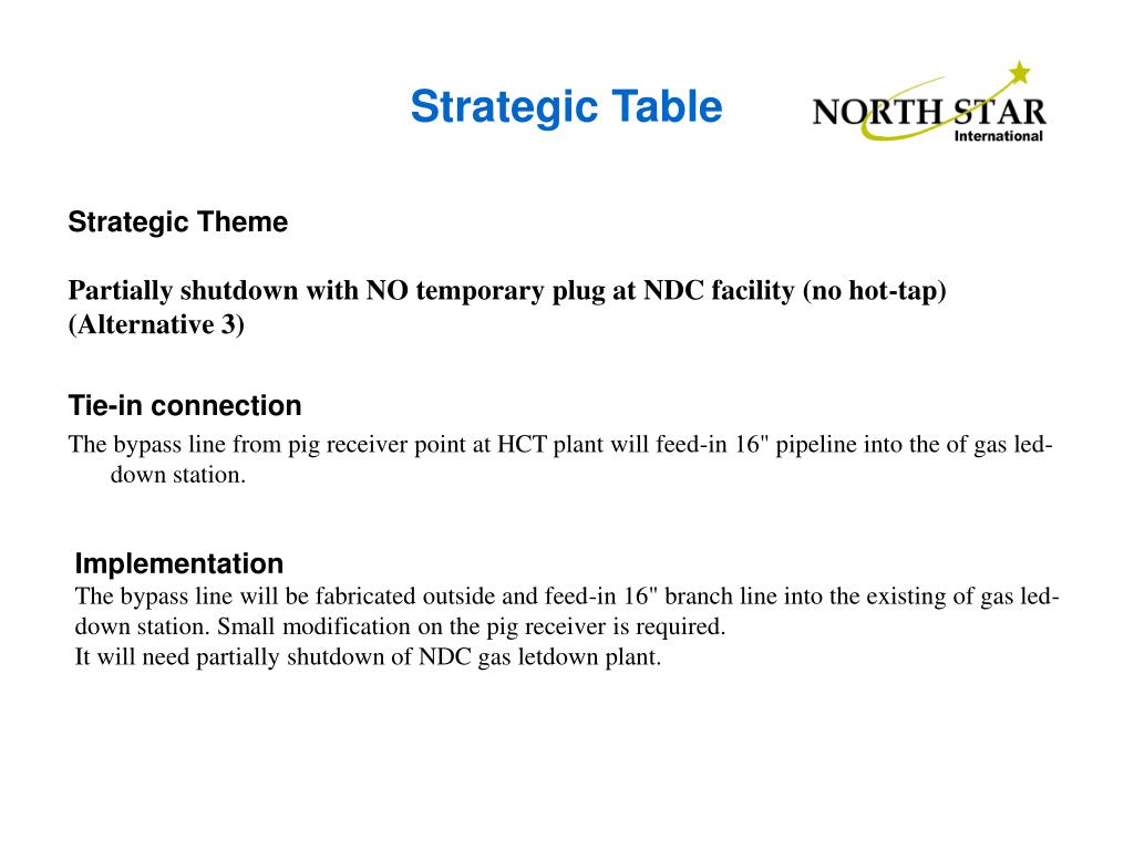 Strategic Table Strategic Theme Partially shutdown with NO temporary plug at NDC facility (no hot-tap) (Alternative 3) Tie-in connection The bypass line from pig receiver point at HCT plant will feed-in 16" pipeline into the of gas led-down station. The bypass line will be fabricated outside and feed-in 14" branch line into the existing elbow of gas led-down station. Hot tap equipment will be required for this temporary plug. Small modification on the pig receiver is required. It will need partially shutdown of NDC gas letdown plant. Implementation The bypass line will be fabricated outside and feed-in 16" branch line into the existing of gas led-down station. Small modification on the pig receiver is required. It will need partially shutdown of NDC gas letdown plant.
