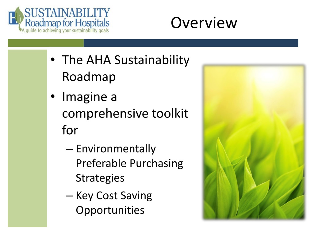 Overview • The AHA Sustainability Roadmap • Imagine a comprehensive toolkit for • Environmentally Preferable Purchasing Strategies • Key Cost Saving Opportunities