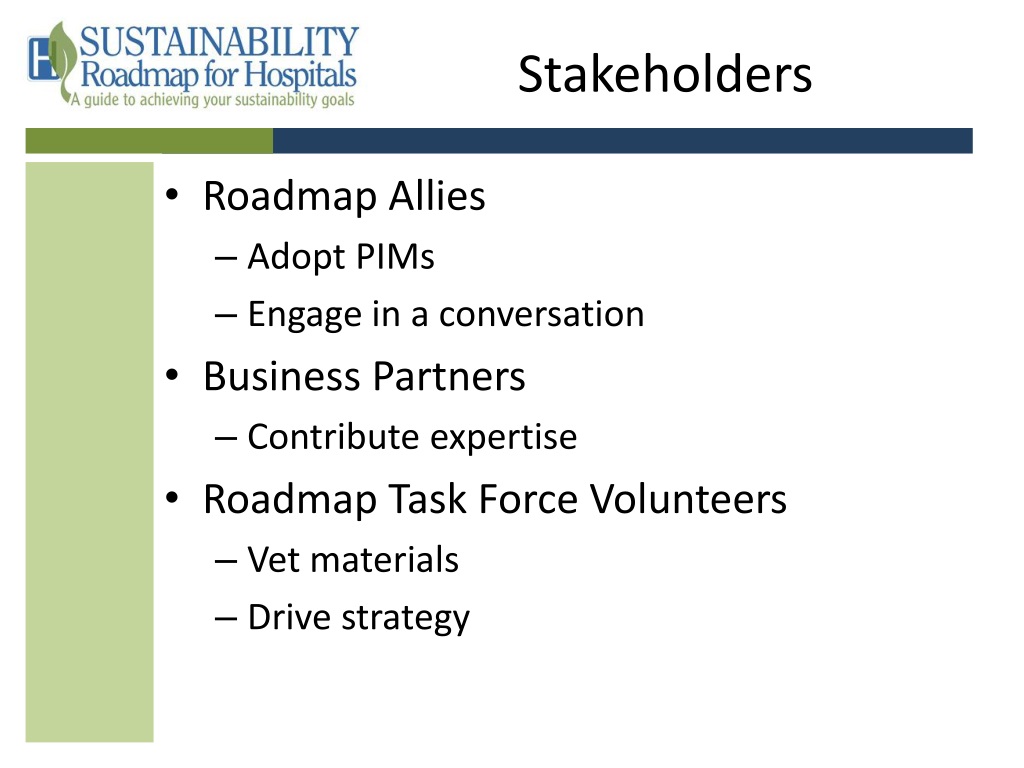 Stakeholders • Roadmap Allies • Adopt PIMs • Engage in a conversation • Business Partners • Contribute expertise • Roadmap Task Force Volunteers • Vet materials • Drive strategy