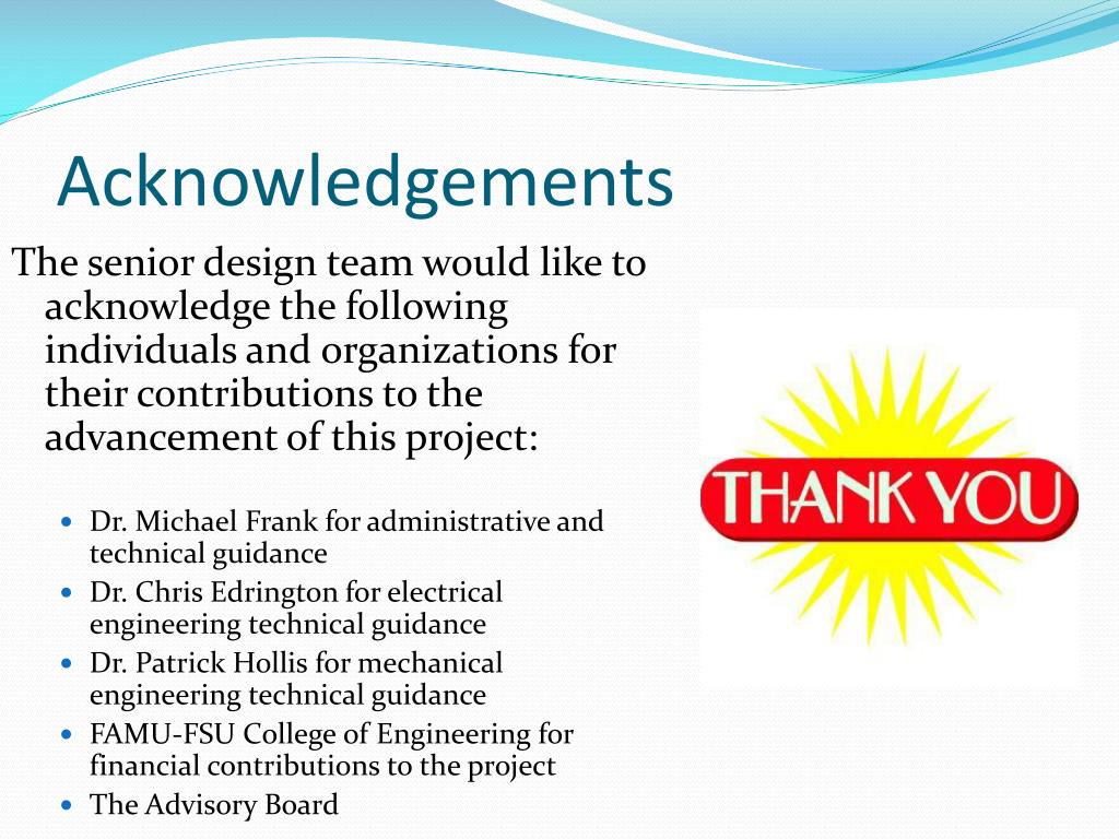 Acknowledgements The senior design team would like to acknowledge the following individuals and organizations for their contributions to the advancement of this project: • Dr. Michael Frank for administrative and technical guidance • Dr. Chris Edrington for electrical engineering technical guidance • Dr. Patrick Hollis for mechanical engineering technical guidance • FAMU-FSU College of Engineering for financial contributions to the project • The Advisory Board