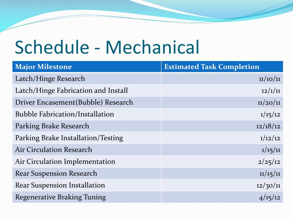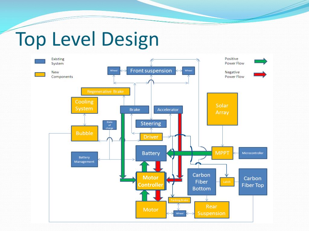 Statement of Problem • Motor Replacement • PV Array • MPPT • Hinge/Latch • Driver Encasement • Parking Brake • Regenerative Braking • Rear Arm & Rear Suspension • Air Circulation