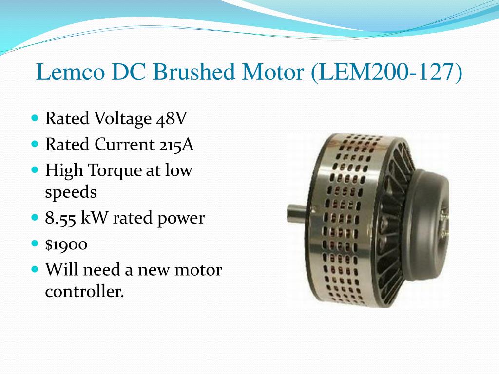 Lemco DC Brushed Motor (LEM200-127) • Rated Voltage 48V • Rated Current 215A • High Torque at low speeds • 8.55 kW rated power • $1900 • Will need a new motor controller.