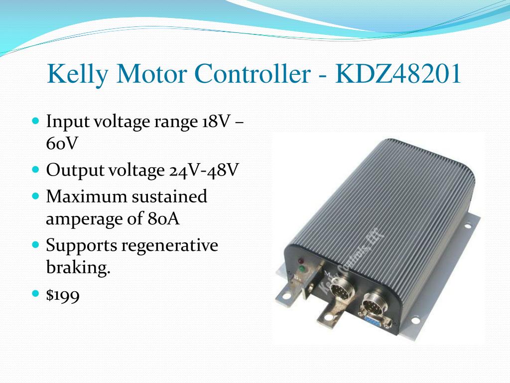 Kelly Motor Controller - KDZ48201 • Input voltage range 18V – 60V • Output voltage 24V-48V • Maximum sustained amperage of 80A • Supports regenerative braking. • $199