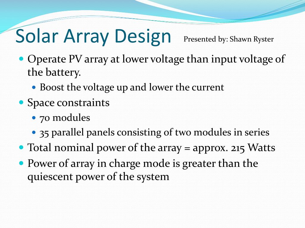 Solar Array Design Presented by: Shawn Ryster • Operate PV array at lower voltage than input voltage of the battery. • Boost the voltage up and lower the current • Space constraints • 70 modules • 35 parallel panels consisting of two modules in series • Total nominal power of the array = approx. 215 Watts • Power of array in charge mode is greater than the quiescent power of the system