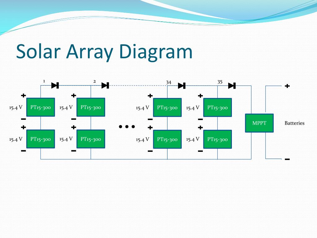Solar Array Diagram 1 35 2 34 PT15-300 PT15-300 PT15-300 PT15-300 … 15.4 V 15.4 V 15.4 V 15.4 V MPPT Batteries PT15-300 PT15-300 PT15-300 PT15-300 15.4 V 15.4 V 15.4 V 15.4 V