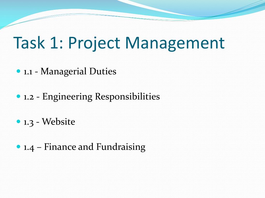 Task 1: Project Management • 1.1 - Managerial Duties • 1.2 - Engineering Responsibilities • 1.3 - Website • 1.4 – Finance and Fundraising