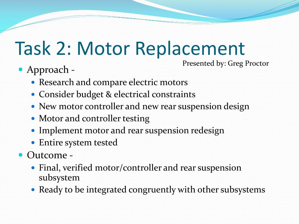 Task 2: Motor Replacement Presented by: Greg Proctor • Approach - • Research and compare electric motors • Consider budget & electrical constraints • New motor controller and new rear suspension design • Motor and controller testing • Implement motor and rear suspension redesign • Entire system tested • Outcome - • Final, verified motor/controller and rear suspension subsystem • Ready to be integrated congruently with other subsystems