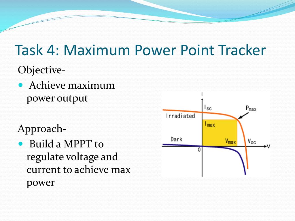 Task 4: Maximum Power Point Tracker Objective- • Achieve maximum power output Approach- • Build a MPPT to regulate voltage and current to achieve max power