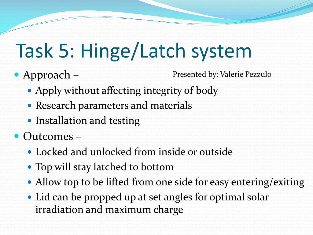 Task 5: Hinge/Latch system • Approach – • Apply without affecting integrity of body • Research parameters and materials • Installation and testing • Outcomes – • Locked and unlocked from inside or outside • Top will stay latched to bottom • Allow top to be lifted from one side for easy entering/exiting • Lid can be propped up at set angles for optimal solar irradiation and maximum charge Presented by: Valerie Pezzulo