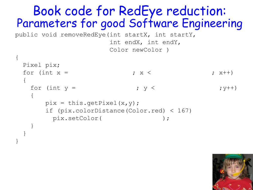 Book code for RedEye reduction:Parameters for good Software Engineering public void removeRedEye(int startX, int startY, int endX, int endY, Color newColor ) { Pixel pix; for (int x = ; x < ; x++) { for (int y = ; y < ;y++) { pix = this.getPixel(x,y); if (pix.colorDistance(Color.red) < 167) pix.setColor( ); } } } Is there anything else We could parameterize?