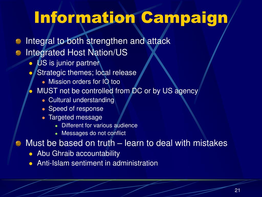 Information Campaign • Integral to both strengthen and attack • Integrated Host Nation/US • US is junior partner • Strategic themes; local release • Mission orders for IO too • MUST not be controlled from DC or by US agency • Cultural understanding • Speed of response • Targeted message • Different for various audience • Messages do not conflict • Must be based on truth – learn to deal with mistakes • Abu Ghraib accountability • Anti-Islam sentiment in administration