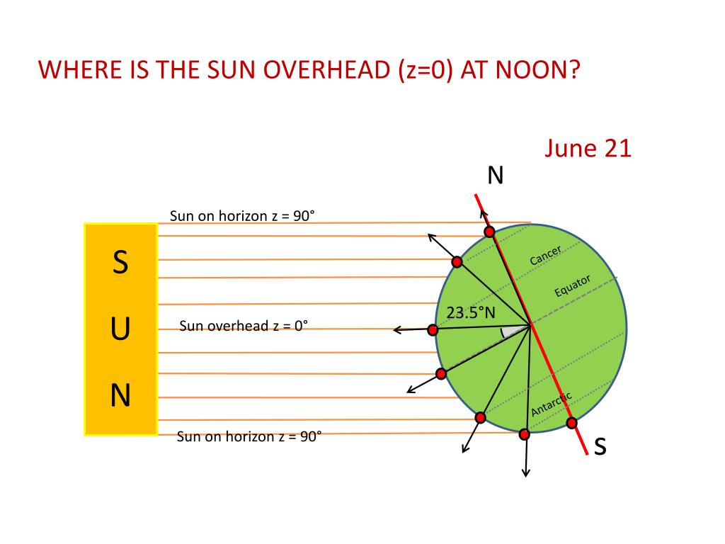 WHERE IS THE SUN OVERHEAD (z=0) AT NOON? June 21 N Sun on horizon z = 90° S U N S Cancer Equator 23.5°N U Sun overhead z = 0° N Antarctic s Sun on horizon z = 90°