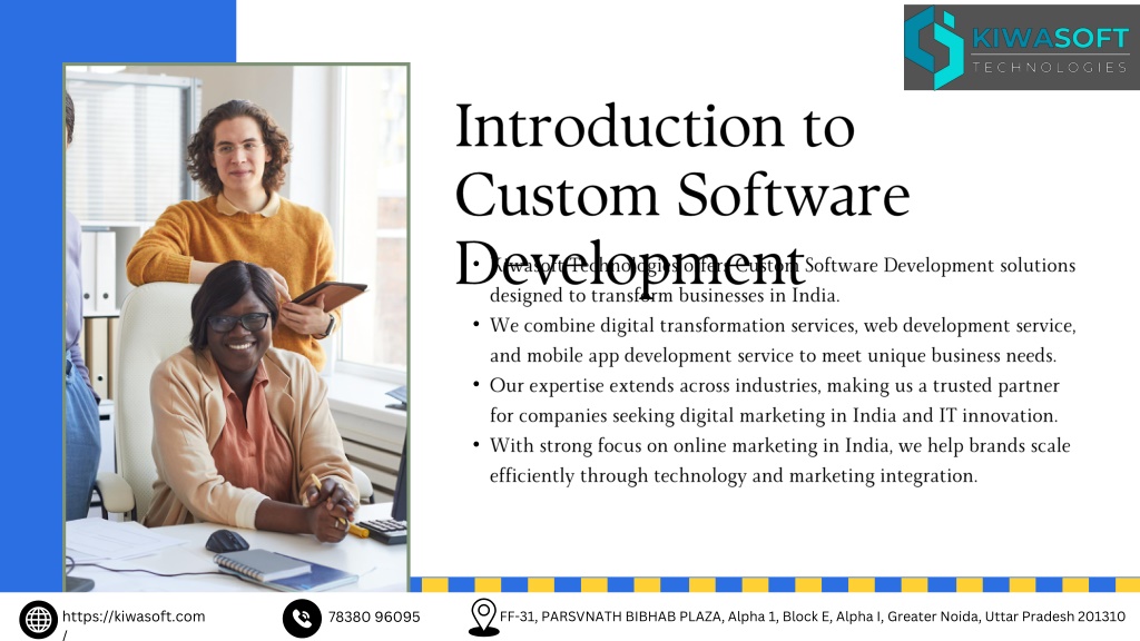 Introduction to Custom Software Development • Kiwasoft Technologies offers Custom Software Development solutions designed to transform businesses in India. • We combine digital transformation services, web development service, and mobile app development service to meet unique business needs. • Our expertise extends across industries, making us a trusted partner for companies seeking digital marketing in India and IT innovation. • With strong focus on online marketing in India, we help brands scale efficiently through technology and marketing integration. https://kiwasoft.com/ 78380 96095 FF-31, PARSVNATH BIBHAB PLAZA, Alpha 1, Block E, Alpha I, Greater Noida, Uttar Pradesh 201310