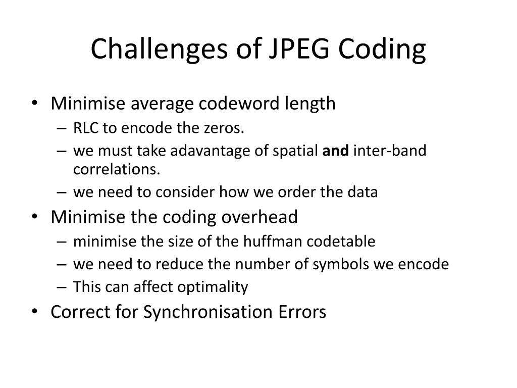 Challenges of JPEG Coding • Minimise average codeword length • RLC to encode the zeros. • we must take adavantage of spatial and inter-band correlations. • we need to consider how we order the data • Minimise the coding overhead • minimise the size of the huffmancodetable • we need to reduce the number of symbols we encode • This can affect optimality • Correct for Synchronisation Errors