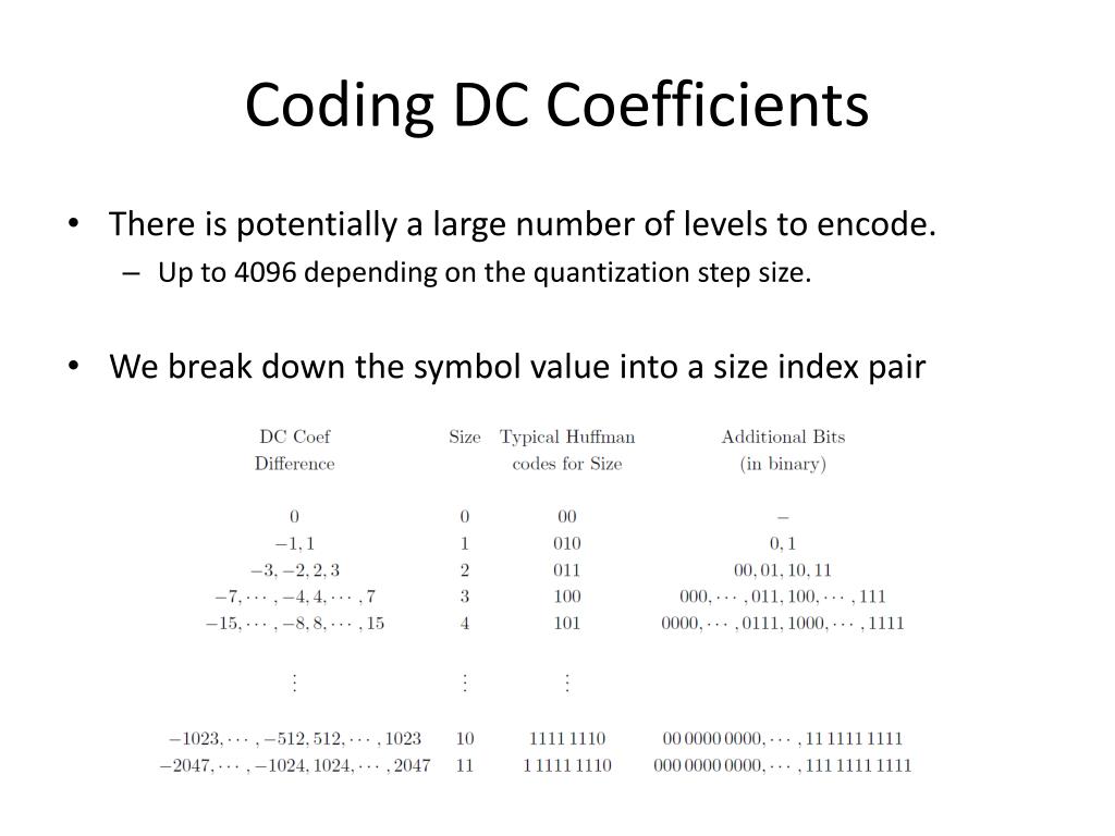 Coding DC Coefficients • There is potentially a large number of levels to encode. • Up to 4096 depending on the quantization step size. • We break down the symbol value into a size index pair