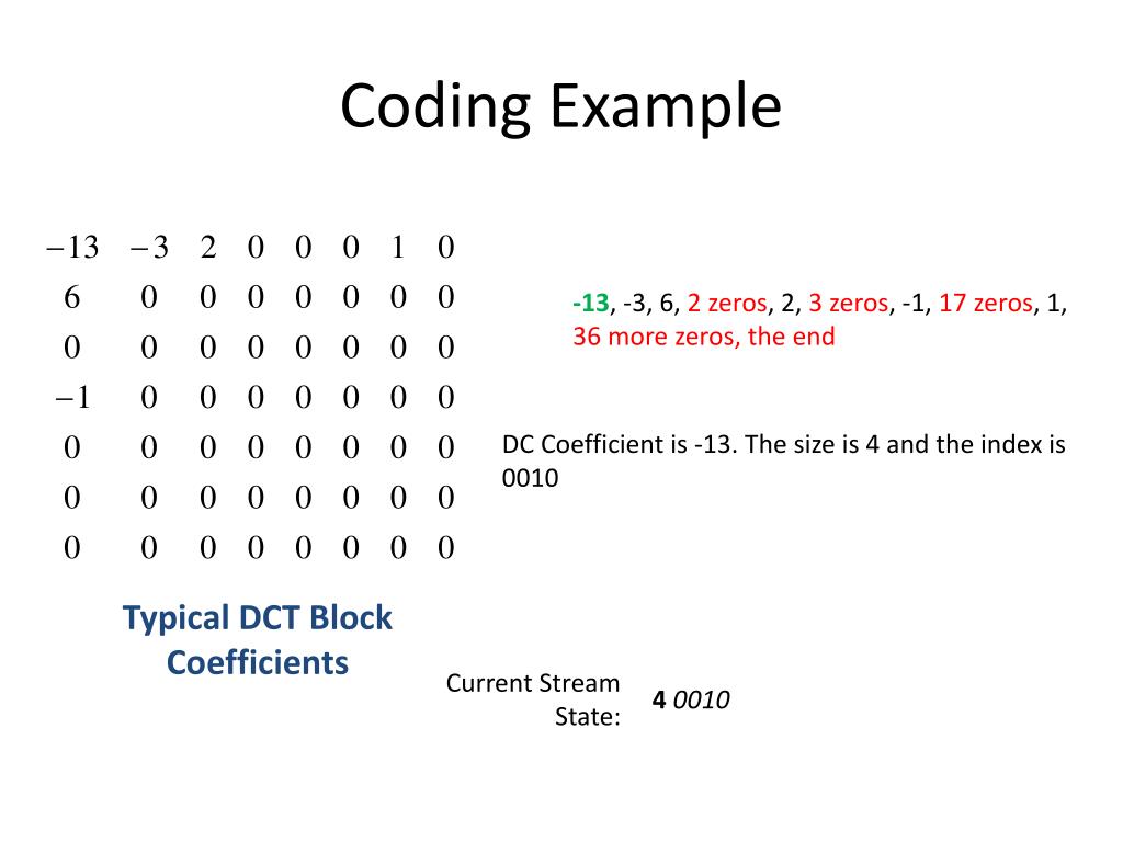 Coding Example -13, -3, 6, 2 zeros, 2, 3 zeros, -1, 17 zeros, 1, 36 more zeros, the end DC Coefficient is -13. The size is 4 and the index is 0010 Typical DCT Block Coefficients Current Stream State: 40010
