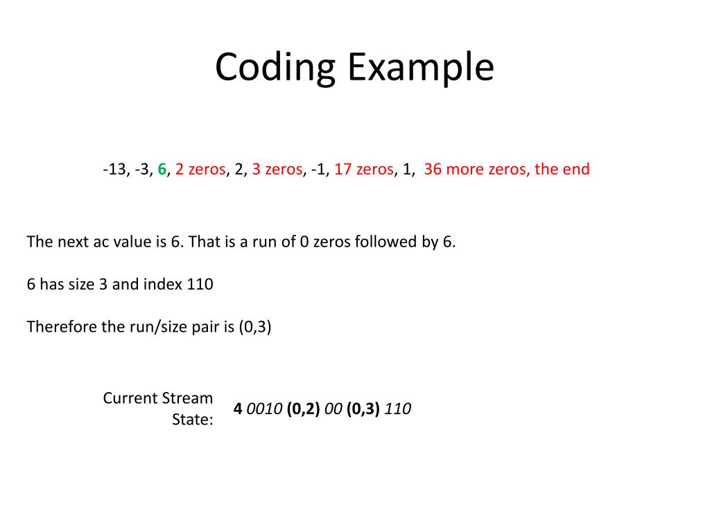 Coding Example -13, -3, 6, 2 zeros, 2, 3 zeros, -1, 17 zeros, 1, 36 more zeros, the end The first ac value is -3. That is a run of 0 zeros followed by -3. -3 has size 2 and index 0000 Therefore the run/size pair is (0,2) Current Stream State: 40010 (0,2) 00