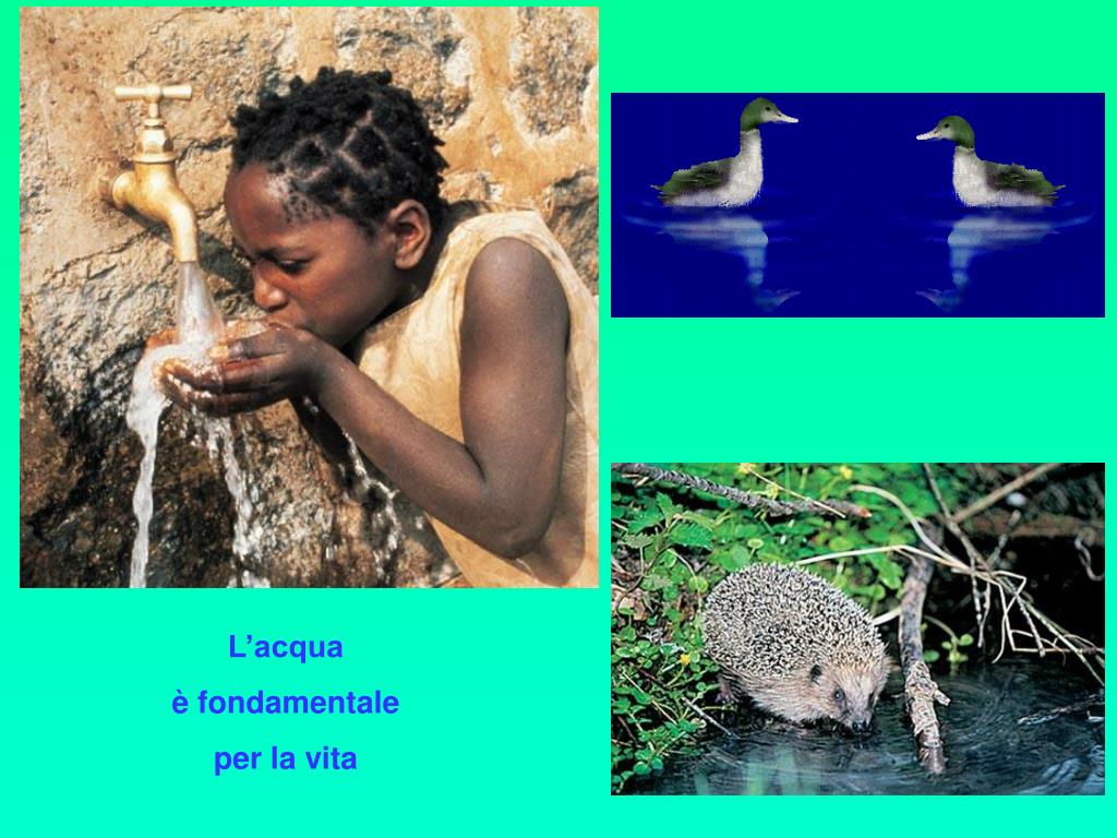 In Italia come va? • L'Italia non è esente dall'emergenza acqua che colpisce e che potrebbe colpire con sempre maggiore intensità nei prossimi decenni il nostro pianeta. • Nonostante ciascun italiano abbia, secondo il Wwf, una disponibilità teorica annua di 2.700 metri cubi a testa di acqua, la quantità reale crolla a 1100 metri cubi a causa dell'inquinamento delle falde e dei fiumi e della rete idrica vecchia e inadeguata, dove il 30% delle riserve si spreca per le perdite e gli allacciamenti abusivi. • L'agricoltura è il settore che incide maggiormente sui consumi idrici, ma a causa delle perdite nella rete, il 70% dell'acqua trasportata per irrigare non raggiunge mai i campi, mentre l'abitudine consolidata a produrre frutta e verdura fuori stagione impoverisce drammaticamente la risorsa e rischia di degradare il suolo per ipersfruttamento.