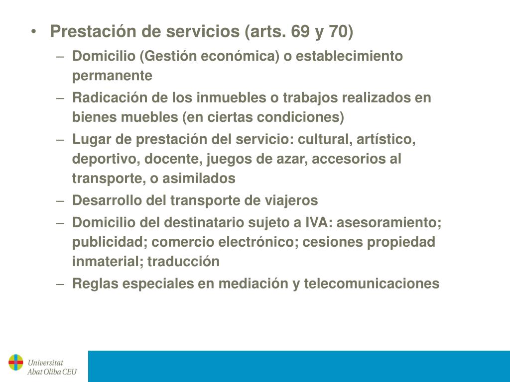 Prestación de servicios (arts. 69 y 70) • Domicilio (Gestión económica) o establecimiento permanente • Radicación de los inmuebles o trabajos realizados en bienes muebles (en ciertas condiciones) • Lugar de prestación del servicio: cultural, artístico, deportivo, docente, juegos de azar, accesorios al transporte, o asimilados • Desarrollo del transporte de viajeros • Domicilio del destinatario sujeto a IVA: asesoramiento; publicidad; comercio electrónico; cesiones propiedad inmaterial; traducción • Reglas especiales en mediación y telecomunicaciones