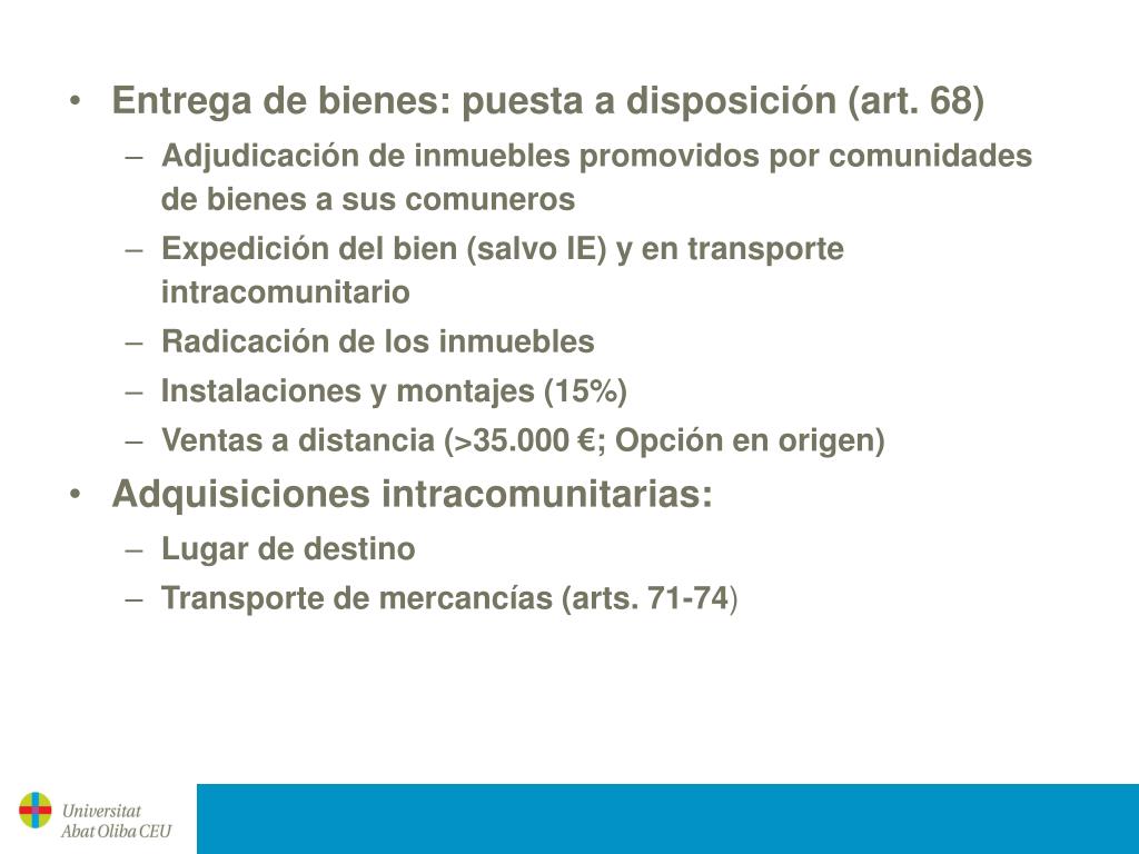 Entrega de bienes: puesta a disposición (art. 68) • Adjudicación de inmuebles promovidos por comunidades de bienes a sus comuneros • Expedición del bien (salvo IE) y en transporte intracomunitario • Radicación de los inmuebles • Instalaciones y montajes (15%) • Ventas a distancia (>35.000 €; Opción en origen) • Adquisiciones intracomunitarias: • Lugar de destino • Transporte de mercancías (arts. 71-74)