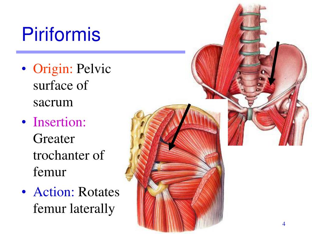 Piriformis • Origin:Pelvic surface of sacrum • Insertion:Greater trochanter of femur • Action:Rotates femur laterally
