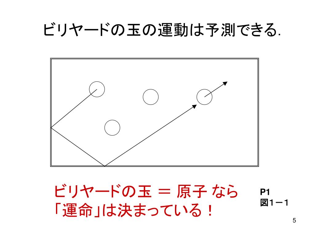ビリヤードの玉の運動は予測できる. ビリヤードの玉 = 原子 なら「運命」は決まっている! P1図1-1