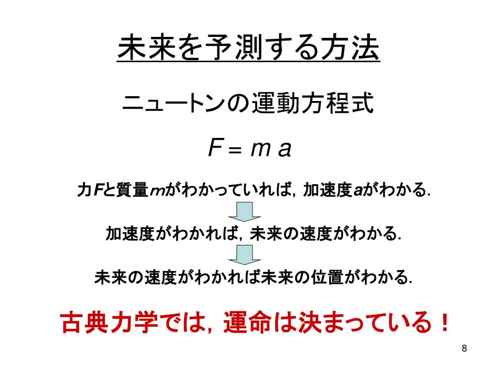 未来を予測する方法 ニュートンの運動方程式 F = m a 力Fと質量mがわかっていれば,加速度aがわかる. 加速度がわかれば,未来の速度がわかる. 未来の速度がわかれば未来の位置がわかる. 古典力学では,運命は決まっている!