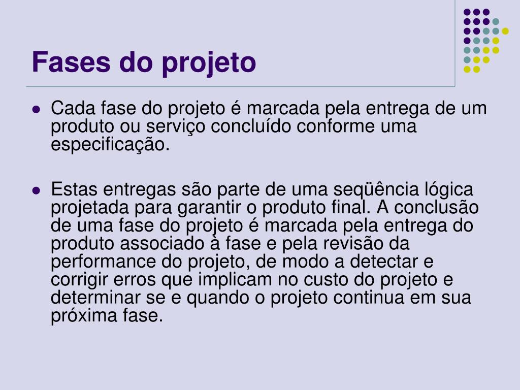 Fases do projeto • Cada fase do projeto é marcada pela entrega de um produto ou serviço concluído conforme uma especificação. • Estas entregas são parte de uma seqüência lógica projetada para garantir o produto final. A conclusão de uma fase do projeto é marcada pela entrega do produto associado à fase e pela revisão da performance do projeto, de modo a detectar e corrigir erros que implicam no custo do projeto e determinar se e quando o projeto continua em sua próxima fase.
