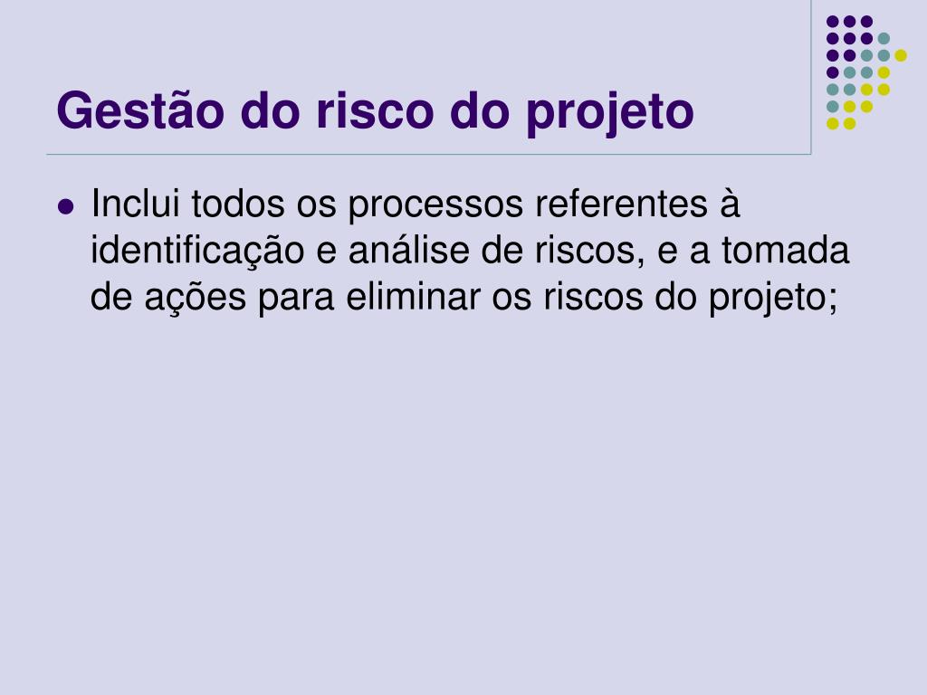 Gestão do risco do projeto • Inclui todos os processos referentes à identificação e análise de riscos, e a tomada de ações para eliminar os riscos do projeto;
