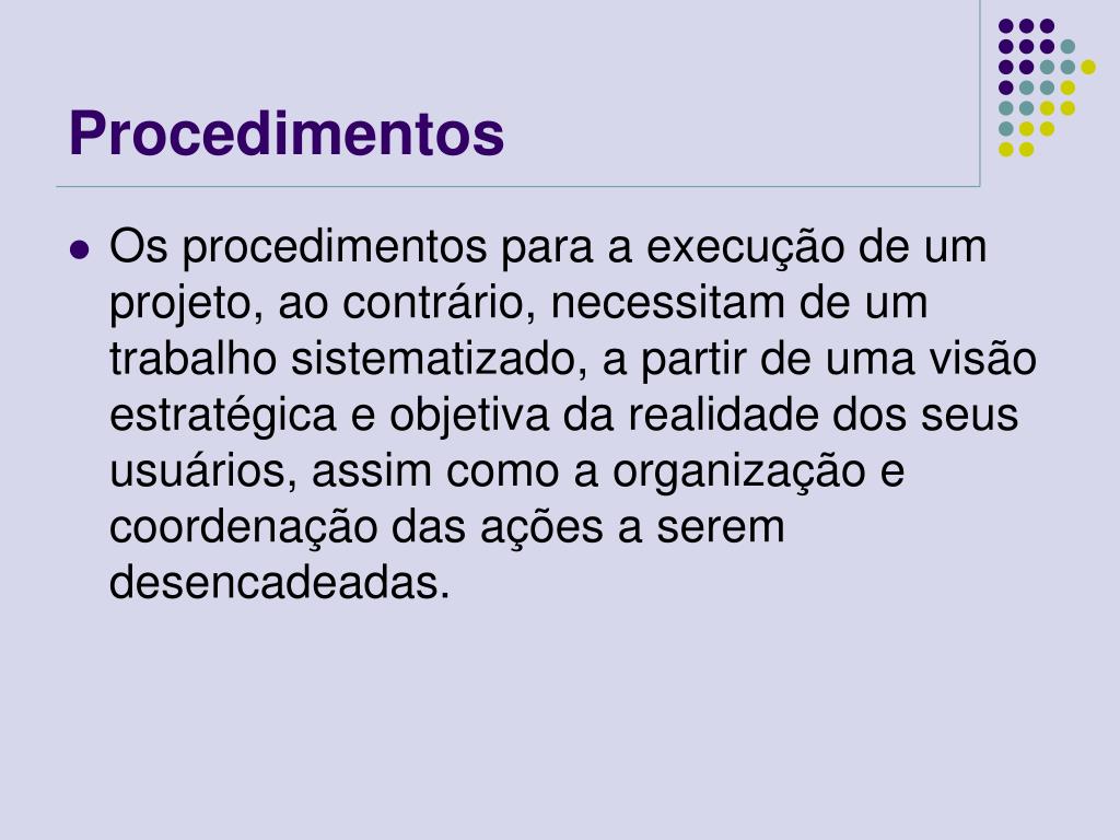 Procedimentos • Os procedimentos para a execução de um projeto, ao contrário, necessitam de um trabalho sistematizado, a partir de uma visão estratégica e objetiva da realidade dos seus usuários, assim como a organização e coordenação das ações a serem desencadeadas.