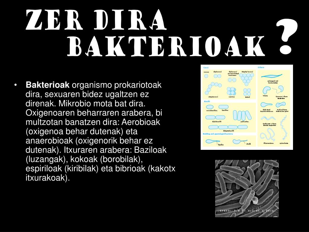 ZER DIRA ? BAKTERIOAK • Bakterioak organismo prokariotoak dira, sexuaren bidez ugaltzen ez direnak. Mikrobio mota bat dira. Oxigenoaren beharraren arabera, bi multzotan banatzen dira: Aerobioak (oxigenoa behar dutenak) eta anaerobioak (oxigenorik behar ez dutenak). Itxuraren arabera: Baziloak (luzangak), kokoak (borobilak), espiriloak (kiribilak) eta bibrioak (kakotx itxurakoak).
