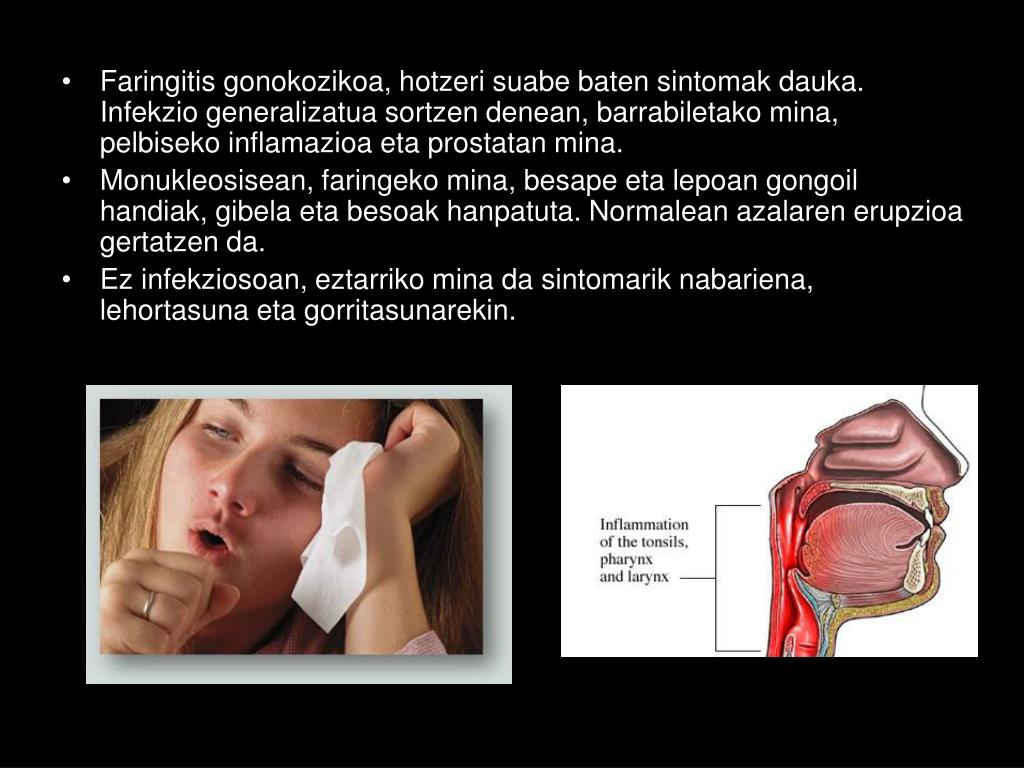Faringitis gonokozikoa, hotzeri suabe baten sintomak dauka. Infekzio generalizatua sortzen denean, barrabiletako mina, pelbiseko inflamazioa eta prostatan mina. • Monukleosisean, faringeko mina, besape eta lepoan gongoil handiak, gibela eta besoak hanpatuta. Normalean azalaren erupzioa gertatzen da. • Ez infekziosoan, eztarriko mina da sintomarik nabariena, lehortasuna eta gorritasunarekin.