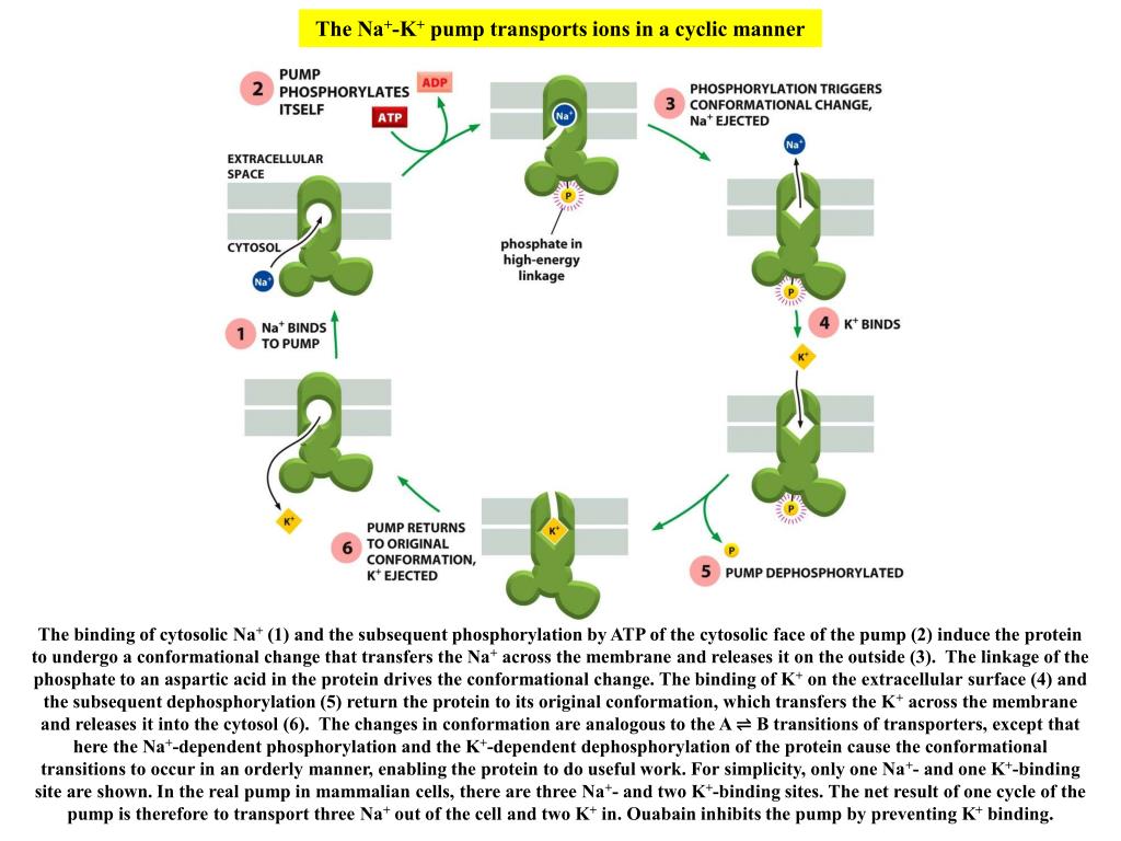 The Na+-K+ pump transports ions in a cyclic manner The binding of cytosolic Na+ (1) and the subsequent phosphorylation by ATP of the cytosolic face of the pump (2) induce the protein to undergo a conformational change that transfers the Na+ across the membrane and releases it on the outside (3). The linkage of the phosphate to an aspartic acid in the protein drives the conformational change. The binding of K+ on the extracellular surface (4) and the subsequent dephosphorylation (5) return the protein to its original conformation, which transfers the K+ across the membrane and releases it into the cytosol (6). The changes in conformation are analogous to the A ⇌ B transitions of transporters, except that here the Na+-dependent phosphorylation and the K+-dependent dephosphorylation of the protein cause the conformational transitions to occur in an orderly manner, enabling the protein to do useful work. For simplicity, only one Na+- and one K+-binding site are shown. In the real pump in mammalian cells, there are three Na+- and two K+-binding sites. The net result of one cycle of the pump is therefore to transport three Na+ out of the cell and two K+ in. Ouabain inhibits the pump by preventing K+ binding.